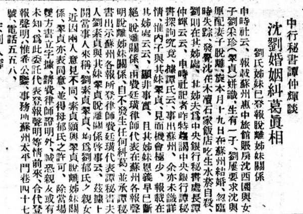 《申报》1936年6月26日第12版载谭光对沈刘婚姻一事的回应