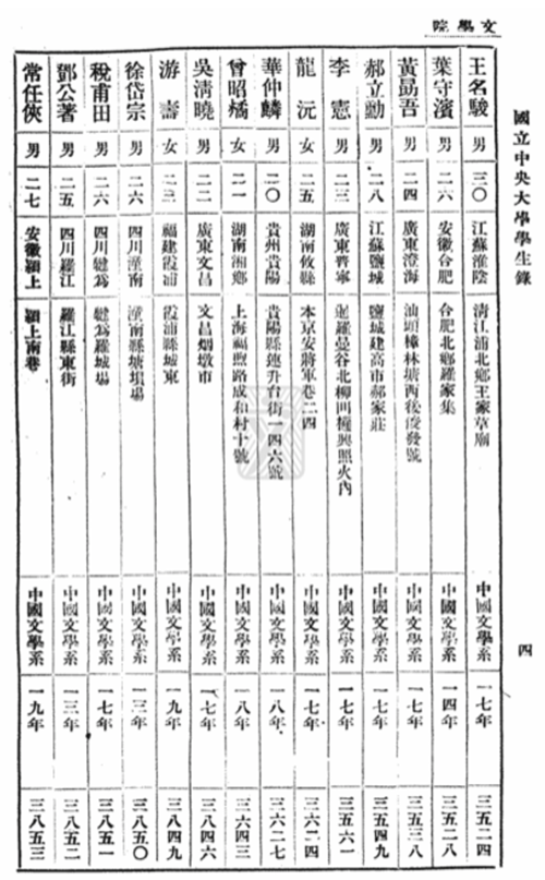 《国立中央大学学生录》所载龙沅、曾昭燏、游寿、常任侠等人学籍信息