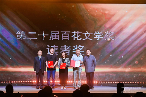脱胎于《小说月报》“百花奖”的“百花文学奖”,始于1984年,至今已有四十年的历史。作为国内首个采用读者投票方式进行评选的文学奖项,“百花文学奖”具有广泛的全民参与性,始终坚持人民立场,以读者心意为基础,以读者选择为最大权重,并设有专门颁发给读者的“读者奖”,堪称当代文学界的“大范围民意测验”。每届“百花文学奖”读者投票环节,全国各地读者们自发地参与进来,为自己喜欢的作品投上神圣的一票。难能可贵的是,颁奖典礼上还邀请获奖读者代表到现场领奖,强化读者的参与性与在场感,读者不再是文学奖项的被动接受者,而是主动参与者,传播效力和评价效力双向赋能,既收到了广泛的文本共鸣、情感共情的效果,又极大地促进了读者参与文学活动的积极性和能动性。2023年,第二十届“百花文学奖”评选吸引近百万名读者关注、投票,组委会从最终获奖作品命中率较高的选票中抽选出三十名幸运读者颁发“读者奖”,并邀请其中的三位到颁奖典礼现场。颁奖典礼当天,还与央视网阅读频道、抖音“大有学问”、QQ音乐、酷狗音乐联合打造“见证文学的力量——第二十届‘百花文学奖’特别节目”的直播活动,。直播曝光超过700万,进入直播间观看人数超过108万。