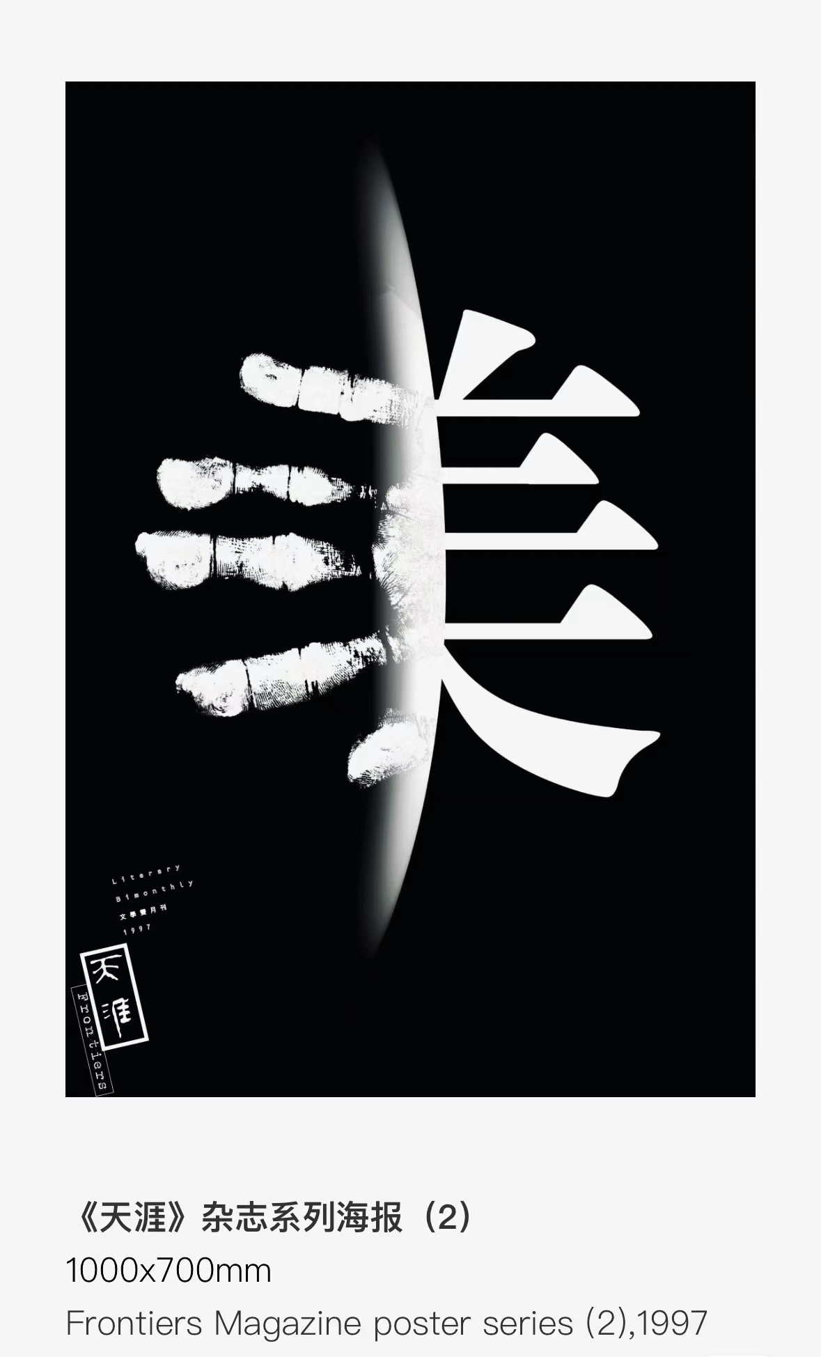 回看1997年,韩家英为《天涯》杂志设计的系列海报,毛笔写就象形的“人”字与篆书“文”字相依,右手五指蘸墨与印刷体的“美”字结合……“人”“文”“美”这几个字很好地体现了《天涯》的精神气质。2024年,《天涯》重新向韩家英发出封面设计的邀请,时隔15年,他重新回到纸媒,不无感慨地说,这次回归让自己与之前有截然不同的感受。2024年的《天涯》封面,韩家英用汉字的“负形”做出独特的图形,每一期的设计元素,都来自唐代诗人王维的一句诗——如何以深具现代性的汉字变体,激活传统文化里的诗意,是这一系列封面的新尝试。