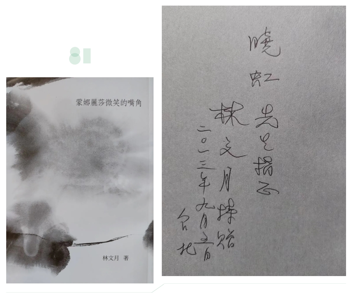 此次台湾之行最大的收获是,得到了林文月先生的签名赠书。这是她的一本文艺评论集,2009年由台北有鹿文化公司出版的《蒙娜丽莎微笑的嘴角》。这个书名让我联想到林先生的笑容。书中收录的近半文章,包括《拟古》,原先都是作为演讲稿写作的。我在介绍各篇来历的《自序》中,还是会看到“为我壮胆不少”“难免有些心悸”这类话。我不知道这是不是林先生生前编印的最后一本书,我仍然从中窥见了林先生做得那么出色的教学和研究,也就是她的“正业”,可能并不是她喜欢的事,而创作和翻译才是她的最爱。