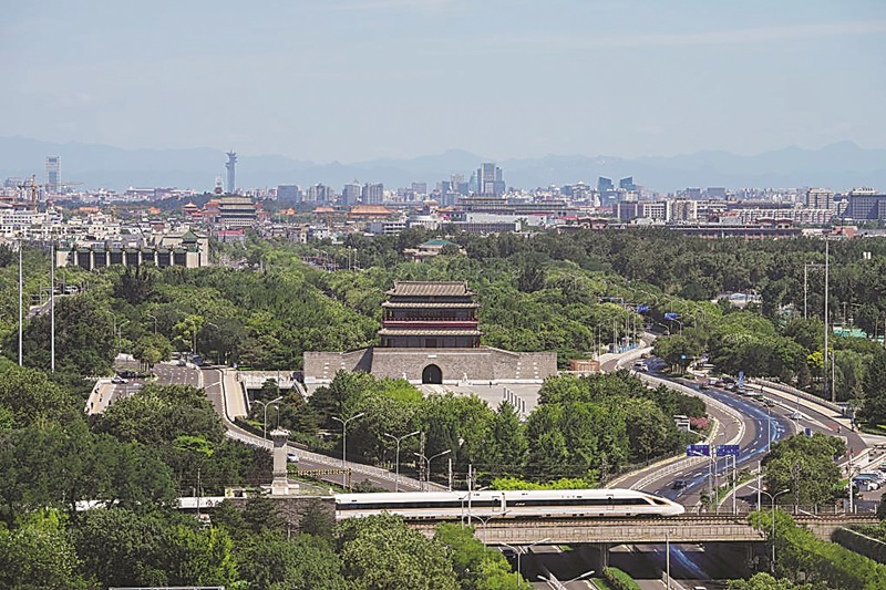 “北京中轴线”纵贯北京老城南北,始建于13世纪,成型于16世纪,此后经不断演进发展,形成今天全长7.8公里、世界上最长的城市轴线。图为7月18日一列复兴号高铁列车驶过北京永定门城楼前。 新华社记者 鞠焕宗 摄