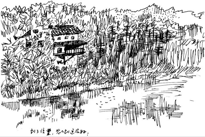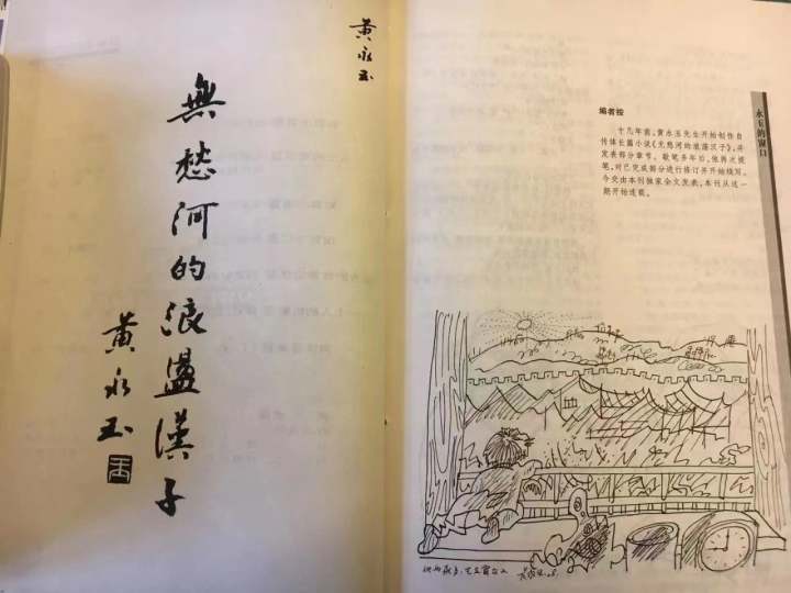 《无愁河的浪荡汉子》2009年开始在《收获》刊发。前面二十万字,是黄先生早已经写好的,曾经在《芙蓉》上发表过,为了这部作品的完整(当时属于正在展开),据说也是为了激励黄先生写下去,李小林老师决定重新以连载的方式刊发,黄先生为每期连载的内容配插图,插图是新创作的。这部长篇巨著的第一句话是:“他两岁多,坐在窗台上。”黄先生配的插图是一个娃娃——也就是后来大名鼎鼎的序子——趴在窗台上,双手搭在栏杆上,正往外看。窗外有房子,有城墙,有山,有太阳正放光芒。近景有一只座钟,时针指在九点上,那序子看到的太阳就是冉冉升起的太阳了。小说连载到2020年,最后一期写的是走南闯北的序子闯荡台湾,遇到了险情,结尾是这样的: