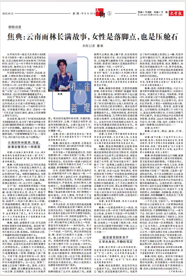 而在新媒体的环境下,青年作家公开表达自我的途径明显增多了,比如正在成为新的宣传场域的小红书等平台,显然更具预见性,有很多作家是从新媒体平台被发现,转向传统期刊,各自为中心,携带着新的知识和经验,也被寄予诚挚的求新的愿景。那报纸、期刊的独特性在哪儿呢?我想到的是为了避免快速时代新媒体的“一闪而过”,一种长期系统性的专业性的观察仍然具有独特的作用,我们试图在碎片化中构建意义,寻找青年写作另一重辽阔之地。为此,《文学报》设有“新锐出发”和“青年漫谈计划”两个常规栏目,前者从单人访谈出发,探寻青年作家文学之路上的创作痕迹;后者则通常由作家与作家/评论家从一些日常话题出发,进行对话,由此打开文学与生活的深度联结。