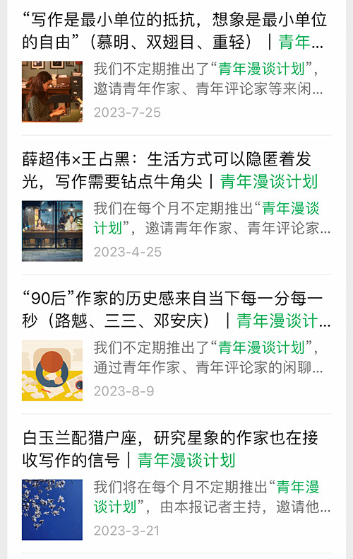 过去的前辈作家们,喜欢将自己隐藏在作品之后,保持某种神秘感。如今青年作家的涌现让我们看到了更多写作者身上的幻彩人生,他们不再遮掩自己的偏好,他们乐于表达自己的观察,他们愿意打开自己联结更多的人。或许他们的写作依然还在起点,仍在勃发,但我们从这两个栏目中,让读者看到了真诚可感的“同代作家”。当有读者表示自己因为这些文字被理解、被共情时,我想,这就是诞生意义的闪光处,也是我们继续与之同行的美好动力。