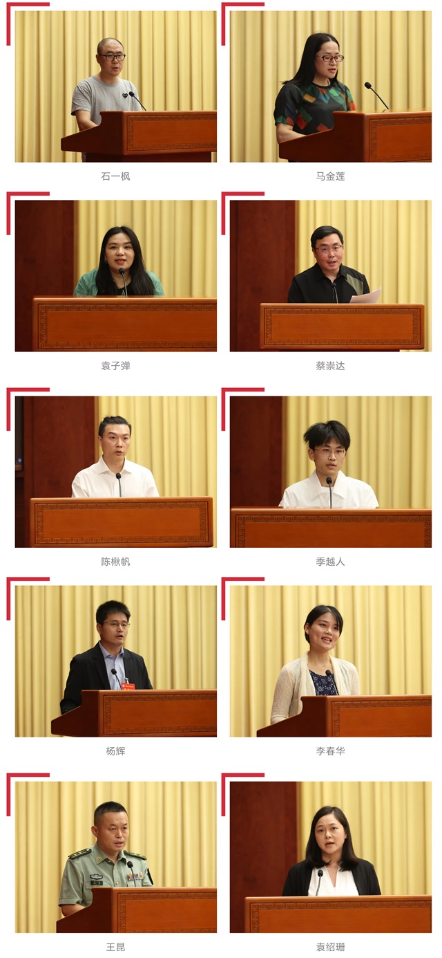 闭幕式上,10位青年作家代表进行大会交流发言,表达了向着更高目标努力的共同志向。来自北京的石一枫从文眼、文心、文采三个角度,畅谈青年作家写作的价值和意义,表示青年作家应该深入社会的第一线,以敏锐的发现和创造,塑造时代的新人物,捕捉时代的新状况,揭示时代的新问题。宁夏“80后”作家马金莲表示,青年作家要不断提高思想境界,磨炼写作水平,始终把身子扑在生活当中,写出更接地气、更有烟火味道的好作品,尤其要继续围绕民族团结下大功夫,为铸牢中华民族共同体意识作出应有的贡献。青年编剧袁子弹谈到,在时间和空间里思考自己的人物、寻找人物的坐标,是行之有效的创作方法。好的文字离不开“准确”和“丰富”,如何最大程度地激活自己的生活体验,展现我们的世界,是一个编剧真正的修行。来自福建的蔡崇达说,多年来,自己一直努力抵达人心的各种幽深处,试图写出尽可能多的人。这不仅是在写出我们的来处,也是在寻找我们的去处。我们是彼此的故乡,是彼此精神赖以生长的立足点。科幻作家陈楸帆表示,新时代的青年作家要有扎根人民的定力、开拓创新的活力、讲好中国故事的能力,应当勇敢地打破传统文学的界限,探索新媒介、新技术与新叙事的结合,创作出具有时代感和前瞻性的文学作品。“00后”网络作家季越人说,写作伴随了他的成长。他一直在创作中寻求严肃文学与网络文学的调和,赋予作品开放的阐释空间。在青年评论家杨辉看来,充分感应广阔、丰富、复杂的时代和现实,形成融通古今、通贯中西的文化视野,始终置身生活和文学现场,于主体和生活世界的交互成就中生成、阐发和回应具体问题,是文学批评发挥其文化创造价值的必要条件。以文学批评的方式深度参与、促进当代文学的文化创造,是为建设中华民族现代文明贡献文学力量的重要方式。来自祖国西北边陲石油城市新疆克拉玛依的李春华是一名女采油工。她感慨道,我们处在一个可以实现自己文学梦想的时代,要坚持心中想去书写的那束光,努力用自己的笔让这束光照进更多人的心中。军旅青年作家王昆表示,要站在时代前沿的哨所,把个人的文学创作更好地延伸到火热的时代生活中,创作更多传承红色基因、讴歌强军实践,有兵味、有战味、有血性的军事文学作品,捍卫清澈的爱与文学的使命,书写我们与祖国的青春。袁绍珊长期在澳门从事文化工作。她希望翻译家多利用澳门的平台优势,促进对外文学交流和文明互鉴,提升中国文学国际传播效能。