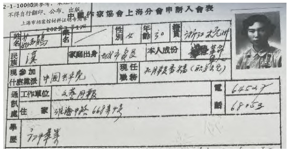 10《中国作家协会上海分会会员表》(茹志鹃),上海档案馆藏,档号:C52-1-100-2。