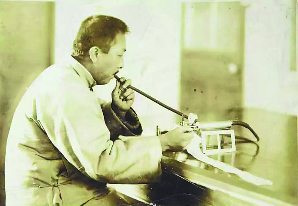 图为刘半农正在做语音实验,以及他发明的语音实验仪器