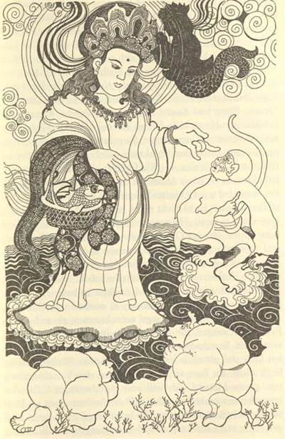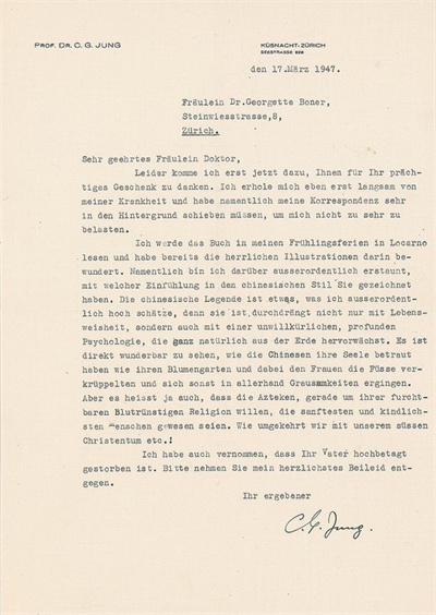 五年后,该书德文本刊行,瑞士女艺术家乔吉特·博纳(Georgette Boner,1903-1998)绘制插图并参与译制。不同于梅纳克脱离文化背景的创作,博纳画笔下的“悟空”重回神猴范畴(图6)。据考证,博纳早在1939至1940年间着手绘制《猴》的插图之时,便亲自争取到译本作图的机会,可见她对全书内容了解透彻。此外,她曾前往印度探望她的姐姐爱丽丝·博纳(Alice Boner,1889-1981),对猴神哈努曼的传说略知一二,而由她姐姐所画的印度叶猴也令其印象深刻,这些因素大概都影响了她用画笔让“悟空”形象重回“正轨”。此外,博纳在译本中的绘画风格还带有些许日本色彩,如她笔下的浪花就与浮世绘极为相似。她曾于1924年求学维也纳,主修艺术,对当时盛行的分离派应不陌生,这或许是她的西游插画融入日本元素的原因。博纳的插图还得到了著名心理学家荣格(Carl G. Jung,1875-1961)的认可,他在该书出版之际特别致信博纳,对博纳充满个人色彩的中国风插图表达赞美(图7)。荣格是卫礼贤挚友,对中国文化有所了解,算得上业余汉学家。能得到他的高度评价,可见博纳本插图之精妙。有趣的是,博纳的德译本于1961年再版,卫礼贤的儿子、汉学家卫德明(Hellmut Wilhelm,1905-1990)为之撰写后记。从卫礼贤到博纳,“悟空”形象也在两代人手中不断变异。