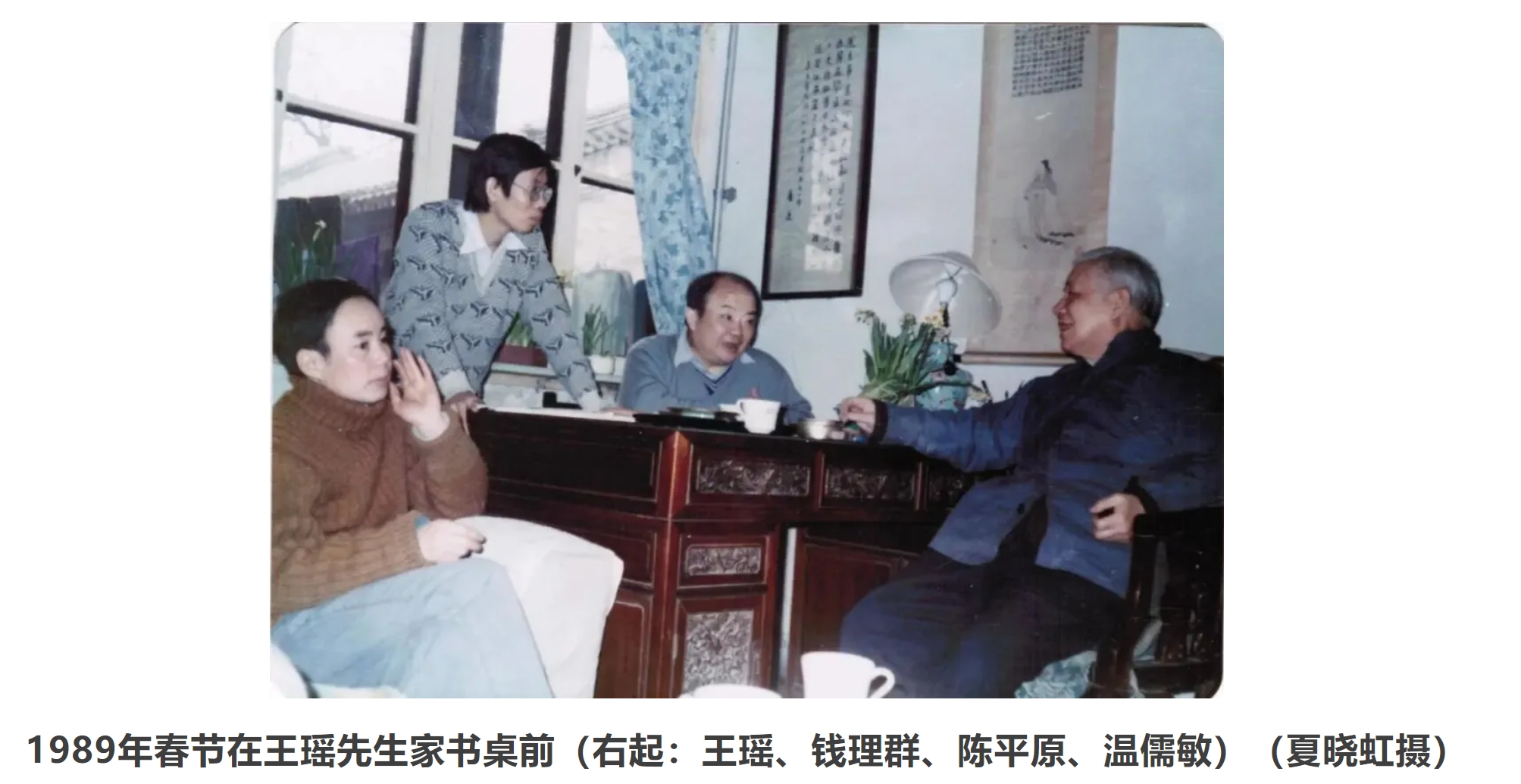 当初自信满满,可那些“如在眼前”的场景,真要复原,没有老照片的帮助,其实很难实现。平日里师友合影,镜头都是对准人物,客厅作为背景,只是露出一角。如今为了学术文献展,需要准确的方位与尺寸,一下子变得困难重重。当然可以随意布置,那样外行是看不出来的,可老学生多有健在者,很容易露馅。模糊的印象大家都有,精确定位却很不容易。翻查了很多老照片,终于找到夏晓虹1989年春节拍摄的一张师生合影,因取景角度不同平常,故得以呈现客厅的基本面貌。这张照片因而成为策展人的宝贝——不仅有资考证,帮助重建“虚拟的客厅”,而且可放置在书桌上,供参观者翻阅对照。