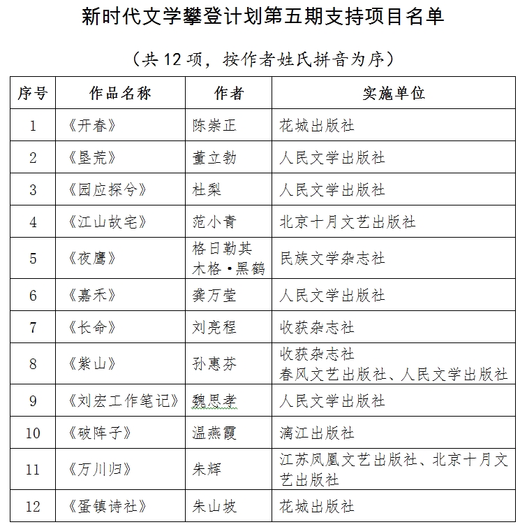 中国作家协会新时代文学攀登计划第五期共收到申报项目91个。经评审委员会评审,并报中国作家协会书记处批准,确定12个项目入选。