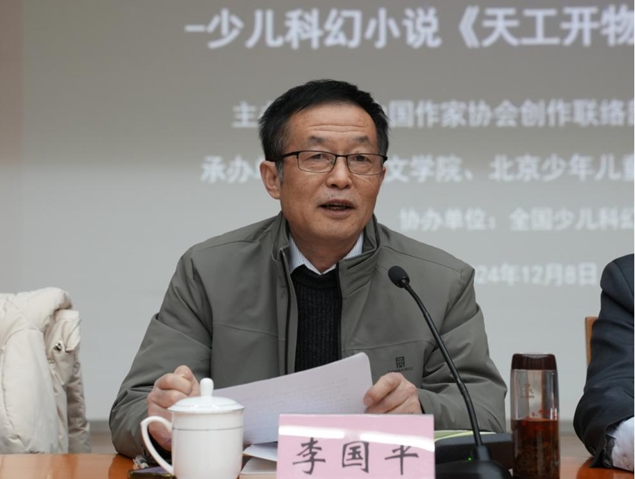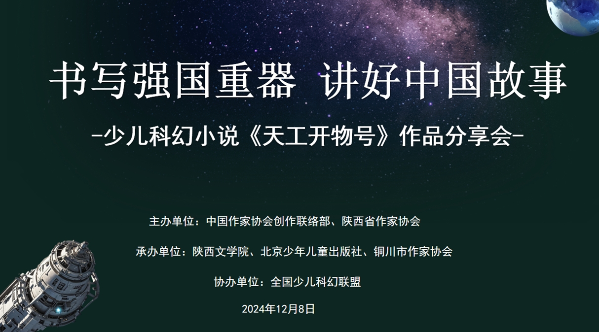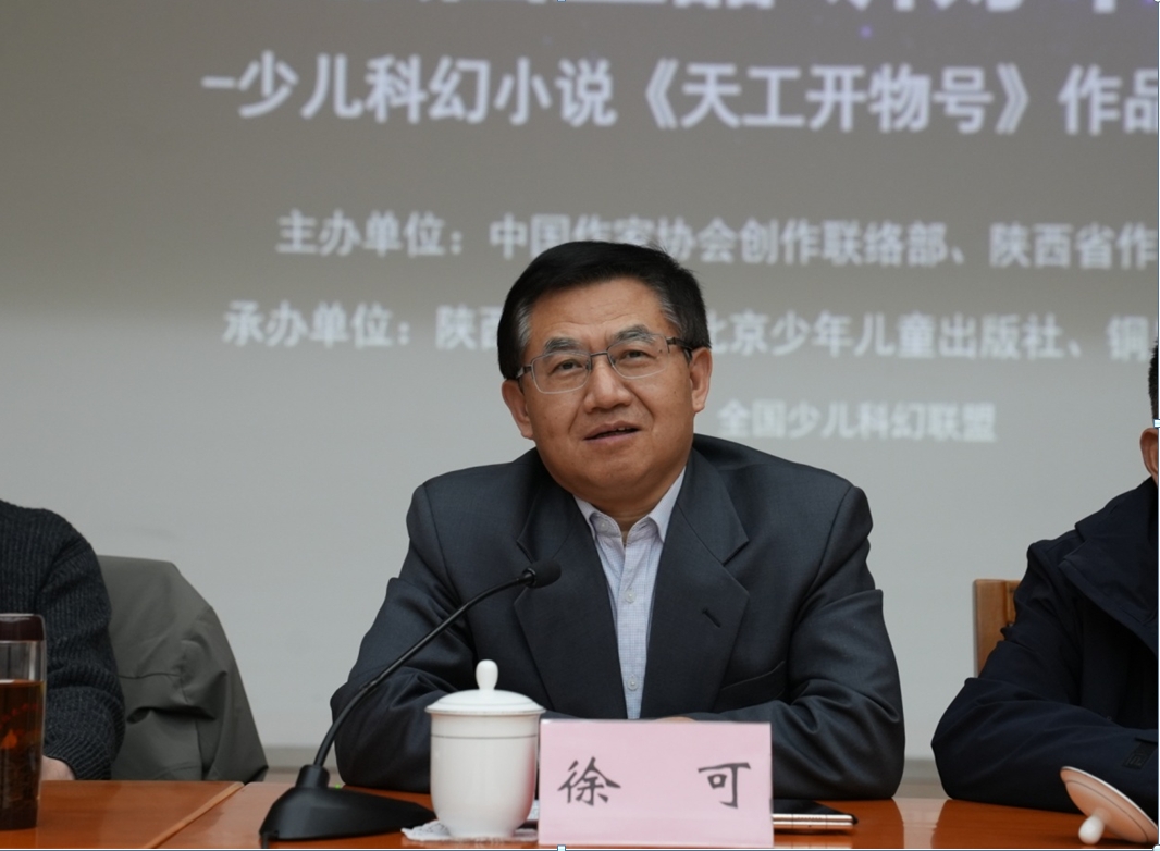 12月8日,由中国作家协会创联部、陕西省作家协会主办,陕西文学院、北京少年儿童出版社、铜川市作家协会承办,全国少儿科幻联盟协办的“书写强国重器,讲好中国故事”张军长篇少儿科幻小说《天工开物号》作品分享会在北京鲁迅文学院举行。中国作家协会创联部主任彭学明,鲁迅文学院常务副院长徐可,陕西省作协副主席李国平,北京少年儿童出版社社长刘卫弘、常务副总编戴迪玲,《科普时报》社长尹传红,中国作家协会创研部副主任纳杨,鲁迅文学院副院长周长超,铜川市文联(作协)党组书记、主席杨晓军、副主席刘娜,中国科学技术出版社科幻分社社长王卫英,北京师范大学文学院副院长、评论家张莉,《科普创作》执行主编姚利芬,陕西文学院常务副院长韩霁虹,陕西师范大学教授李震,北京市作协驻会副主席周敏,山西文艺评论家协会副主席崔昕平,中国作协儿委会委员陈诗哥,少儿科幻星云奖组委会秘书长阿贤,少儿科幻作家赵华、超侠、陆杨、左文萍,本书作者张军(笔名:小高鬼)等40余人与会。会议由北京少年儿童出版社副社长马姗姗主持。