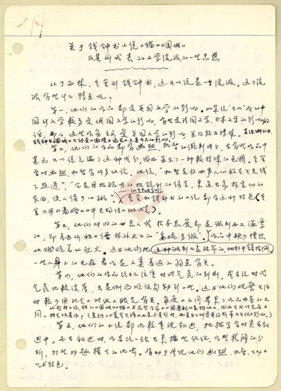 1严家炎:《关于钱钟书小说〈猫〉〈围城〉及其所代表的文学流派的一些感想》,未刊稿,中国现代文学馆“严家炎文库”馆藏手稿。这份未刊手稿有4种材料,共10页。