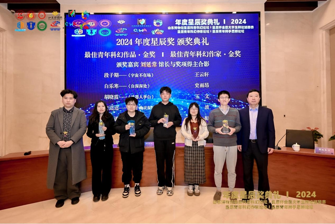 12月22日,2024博物馆与科普科幻论坛暨年度星辰奖典礼系列活动在山东博物馆学术报告厅举行。本届系列活动由中国文化产业协会文化元宇宙专委会科幻与未来科技发展研究中心、电子科技大学数字文化与传媒研究中心主办。山东博物馆党委书记、馆长刘延常出席活动并致辞。电子科技大学数字文化与传媒研究中心主任、中国文化产业协会文化元宇宙专委会副秘书长谢梅,中国大百科全书出版社副牌社知识出版社常务副社长张京涛,科幻作家超侠以及20余位获奖作者与会。本届系列活动包括2024博物馆与科普科幻论坛、2024年度星辰奖颁奖典礼、2024星辰杯全国大学生辩论巡回赛·总决赛暨个人巅峰赛、星辰青年科幻作家论坛、星辰青年辩手思辨论坛等。