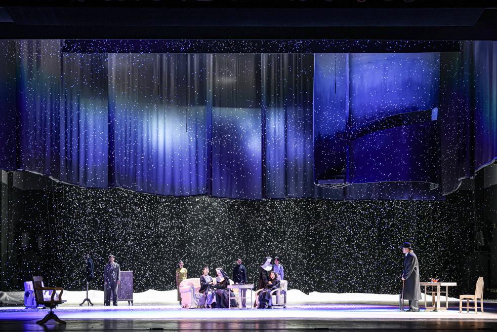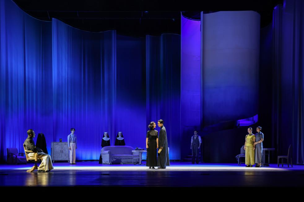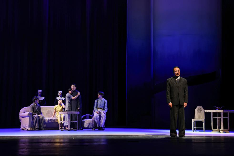 李六乙介绍,此次排演依据1936年发表的单行本,恢复了多数演出中被删掉的遥相呼应的“序幕”和“尾声”——年老的周朴园在精神病院探望蘩漪和侍萍两个疯女子——也找回了很多演出版本删掉的台词;舞台上,象征“深渊”的蓝色简约布景,与寓意丰富的舞台调度与表演,共同营造出一个既真实又虚幻的世界。