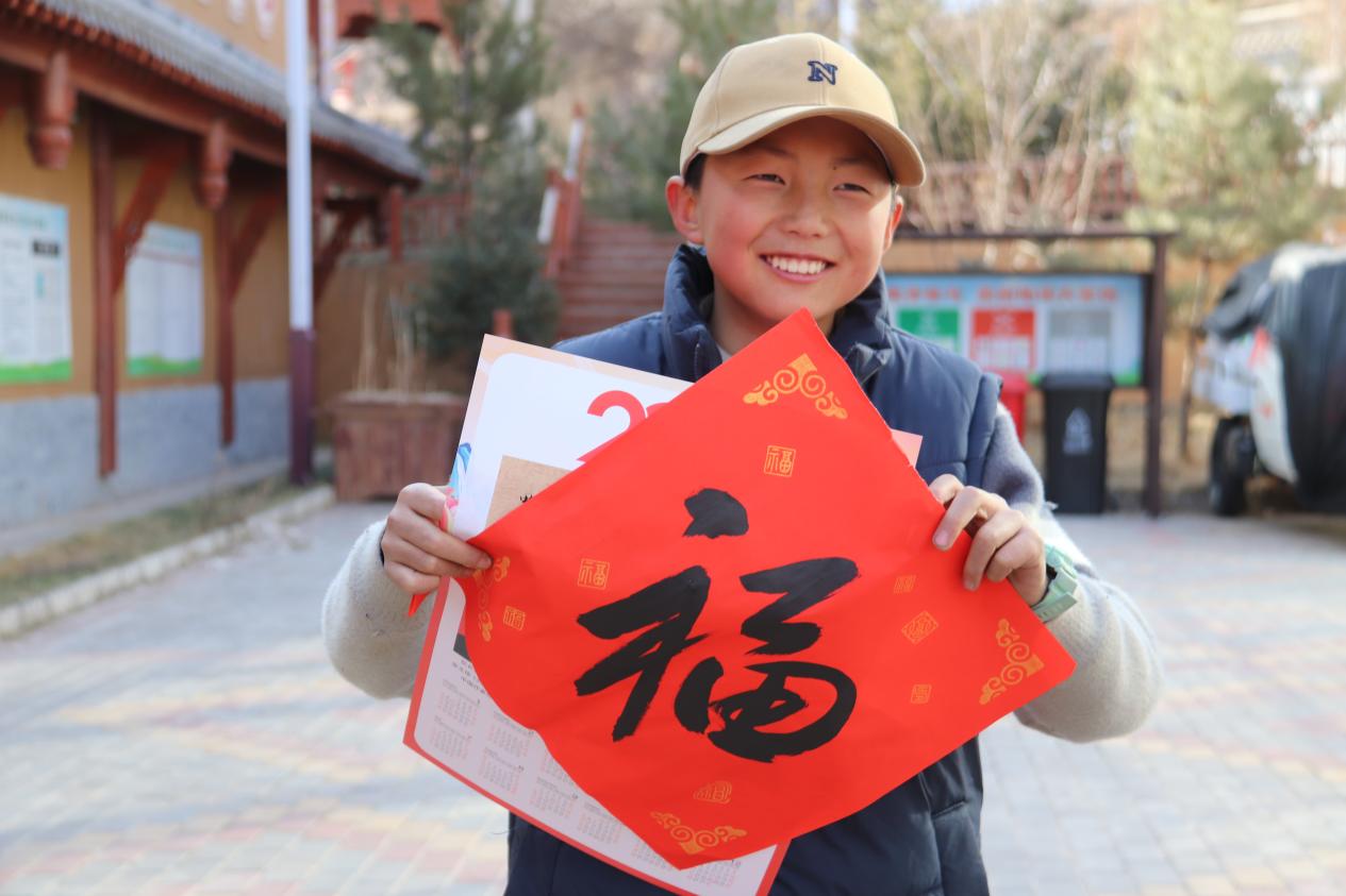 拿到福字的小朋友露出开心的笑容