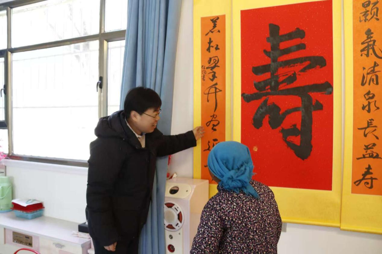 送春联活动结束后,池沟村党支部组织走访慰问村内八十周岁以上老年人,为他们送去书法名家创作的中堂寿联和米、油等生活用品。每到一户,走访人员都与老人倾心交谈,陪他们唠家常,关切询问老人的日常生活、健康状况,并和家人共同把中堂寿联挂好,向老人介绍中堂寿联创作及作者情况,转达来自千里之外的祝福,为老人祝寿添福,以诗词寿联、中堂书法独特的文化韵致,德化人心、滋养家风,传扬尊老敬老爱老的传统美德。
