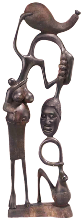 自1999年11月始,达斯塔尼的创作风格又有了新的变化和突破,他用不规则的木段做材料,根据木段本身的原始形状,只在部分位置稍加雕琢,创作出一批风格鲜明的作品。有的仅在木料上动寥寥数刀就成就了一件经典之作,如乌木雕《祖母印象》,创作于1999年12月。有一天,达斯塔尼来到我们在达累斯萨拉姆的艺术基地,看见中国木匠正在我家木门上雕刻图案,那是具有中国传统风格的梅花鹿、仙鹤、松鼠,他对我说:“他们雕刻的是中国风格,我能雕出马孔德风格的作品。”说罢就朝堆放木头的地方奔去,从我们从锯木厂运来的边角料中选出一块还带着树皮的长形乌木板。过了两天,他兴冲冲地来了,手里提着一个塑料袋,里边就装着这件名为《祖母印象》的作品。当打开袋子时,我开始感到诧异,为什么称这件没有任何具象表达的作品为“祖母”?我突然想到要换个思维模式欣赏它,于是眯起双眼,转动大脑,细心体会——原来这是作者心中的祖母,一个婀娜妩媚的美丽妇人。作者在作品中注入了对祖母的无限崇敬和欣赏,他通过《祖母印象》向世人传递着对女性的尊重与崇敬,这件雕塑也开创了马孔德现代雕塑的新形式。