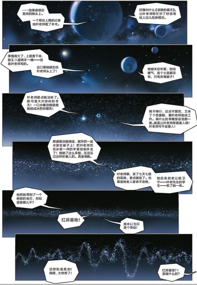 宇宙尺度由近至远,通过两页图就将叶文洁的过往都交待了