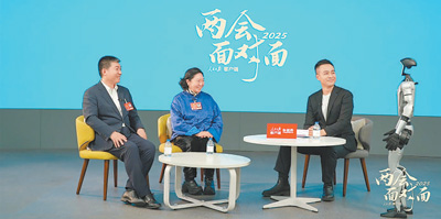 访谈现场,两位嘉宾与智能机器人助手互动。(人民日报社新媒体中心供图)
