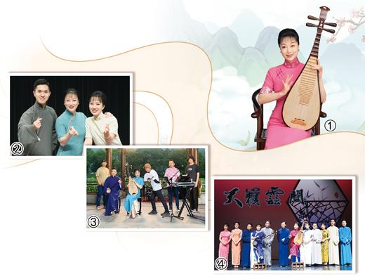 图②:盛小云(中)带领徒弟陆佳麒(左)、谢岚(右)演出长篇评弹《啼笑因缘》。