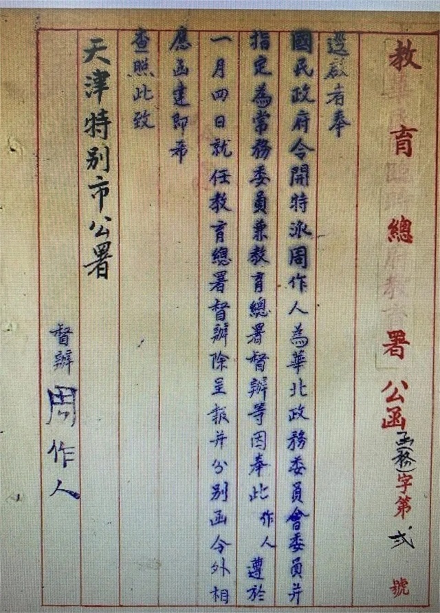 一月六日,周作人以伪华北政务委员会委员兼教育总署督办名义,签发教育总署公函函(务)第贰号,致天津特别市公署,转达南京国民政府令: