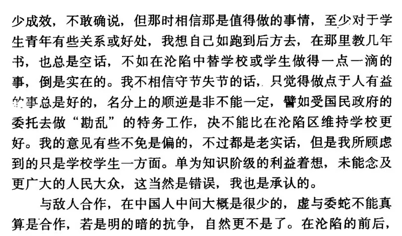 日军侵华战争,给中华民族带来多大的灾难,中国军民死伤多少,周作人从不在文章中叙说。因为他躲过了战争的苦难,也不知国人深重的灾难。我虽无法计算出中华民族在这场灾难中军民的死伤人数,但我可以计算出周作人“落水”后的金钱收入,为侵华日军伤病员捐款多少。一身“落水”一段孽缘,以后的岁月里,“通谋敌国,图谋反抗本国”的周作人,一直不停地为自己“落水”辩解,在一九四九年七月四日给周恩来写信,把旧政权“戡乱”、刺杀他的“特务”与他“落水”“失节”不为旧政权“守节”扯到一起:“我不相信守节失节的话,只觉得做点于人有益的事总是好的,名分上的顺逆是非不能一定,譬如受国民政府的委托去做‘戡乱’的特务工作,决不能比在沦陷区维持学校更好。我的意见有些不免是偏的。与敌人合作,在中国人中间大概是很少的,虚与委蛇不能真算是合作,若是明的暗的抗争,自然更不是了。”