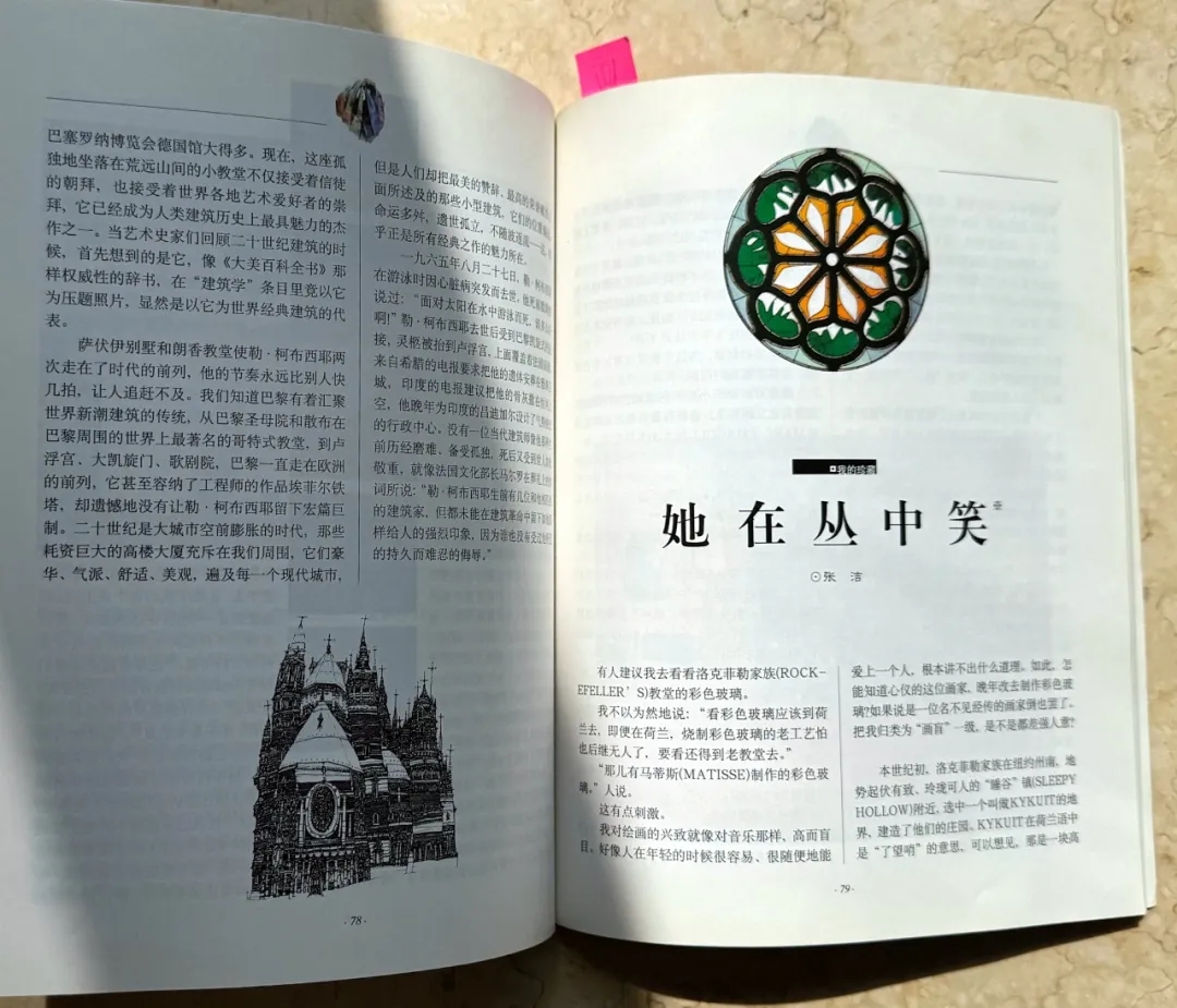 信中所说文章,发表在张炜和我主编的《唯美》杂志上,这杂志其实只出了一期,因我工作调动而夭折。文章题目是《她在丛中笑》,写洛克菲勒家族教堂里,马蒂斯设计创作的彩色玻璃,同时配发一幅张洁拍摄的彩色图片。马蒂斯完成这件彩色玻璃的设计两天后就去世了,两年后(1956年)才由工匠完成。张洁很为发现马蒂斯这件艺术品,并写文章介绍而得意,因为有关马蒂斯的资料中没人提起他这件最后的作品。