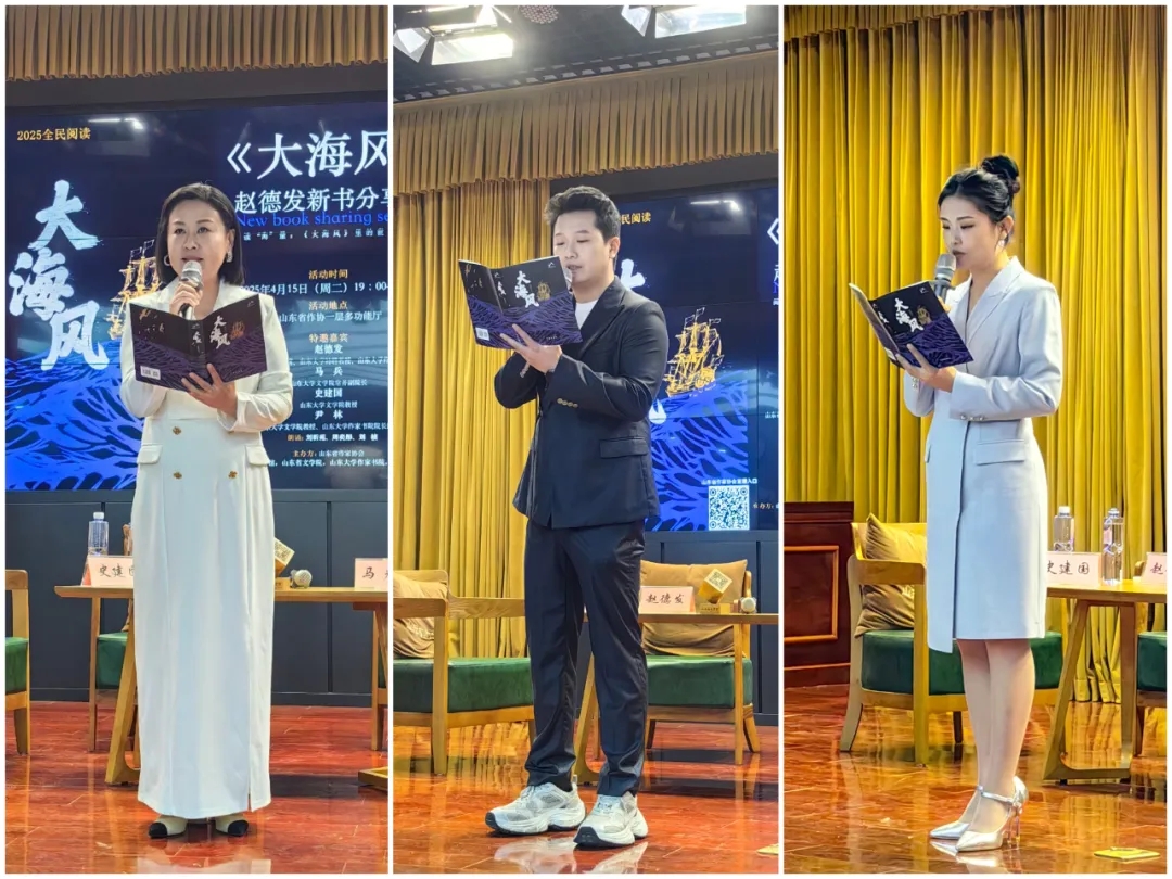 为让观众更直观地领略作品的魅力,分享会上,山东广播电视台文艺广播的主播刘昕苑、周奕彤、刘桢诵读了《大海风》中的精彩篇章。他们声情并茂的演绎,让听众仿佛置身于文学与情感交织的海洋,对现实生活有了更深的思考和认识。