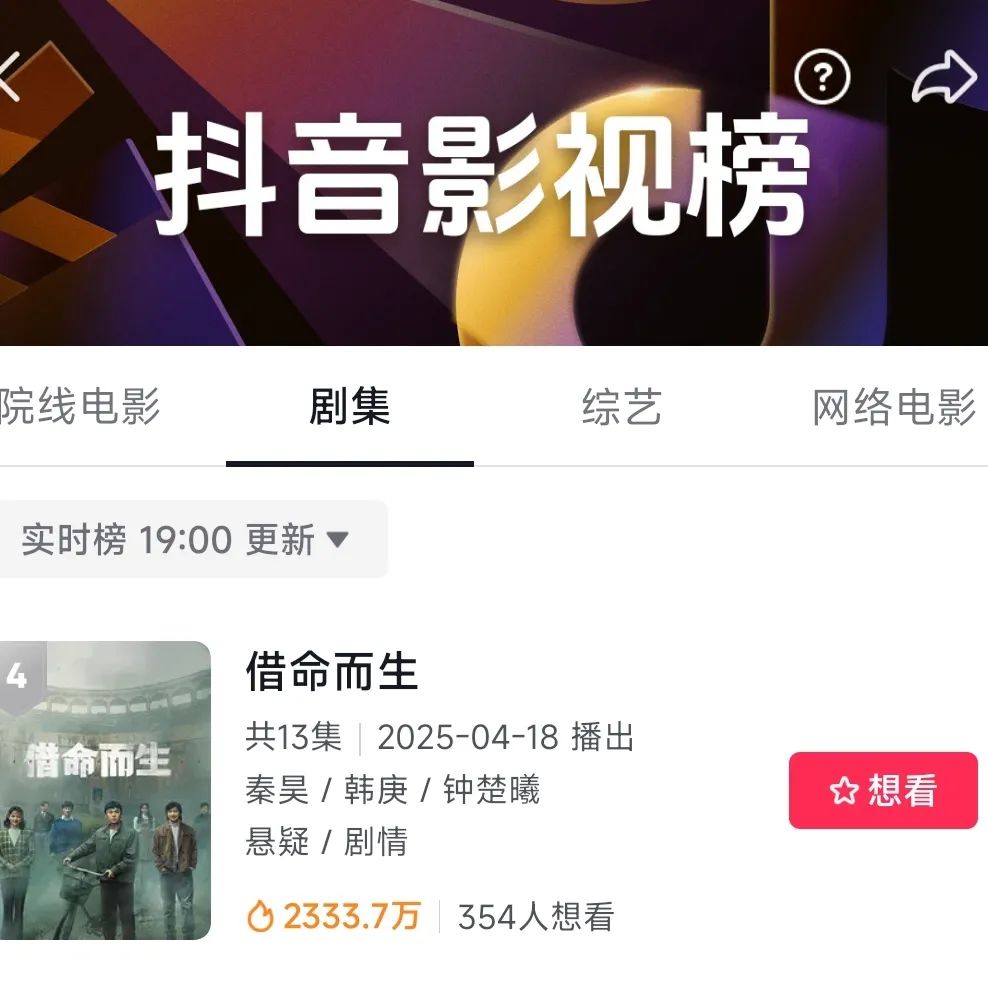 临近开播,电视剧《借命而生》爱奇艺预约量突破150万,抖音剧集榜热度值达2333.7万。