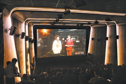 4月19日晚,观众在中影国际影城天天中影店观看话剧《林则徐》“第二现场”直播。