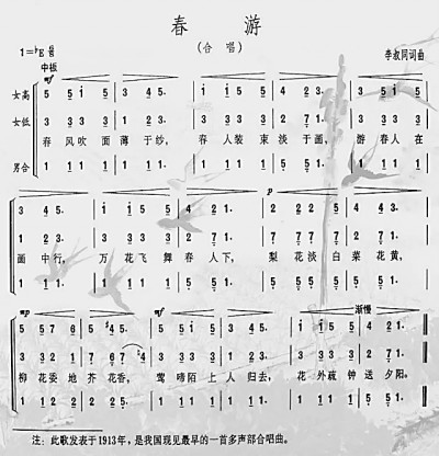李叔同发表于1931年的《春游》,是我国现见最早的一部多声部合唱曲。
