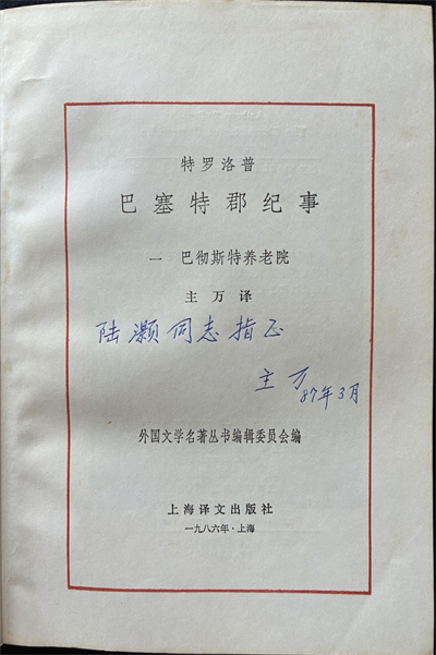 主万先生与我却有过一段交往。上世纪八十年代后期,我采访了多位沪上老翻译家,曾去华山路主万先生府上拜谒,听他介绍刚完成翻译的英国作家特罗洛普。主万先生在上世纪五十年代曾翻译了特罗洛普长篇小说《巴塞特郡纪事》的第一部《巴彻斯养老院》,三十年后又完成第二部《巴彻斯特大教堂》的翻译。我在介绍文章中说这部小说“给了我们一些比民族性更广泛、更深远的东西,最终是来源于对人类的一种透彻、全面的认识与了解”,肯定是主万先生说的话。《养老院》和《大教堂》收入“外国文学名著丛书”,分别于1986年6月和1987年1月由上海译文出版社出版,主万先生都签名送了我。