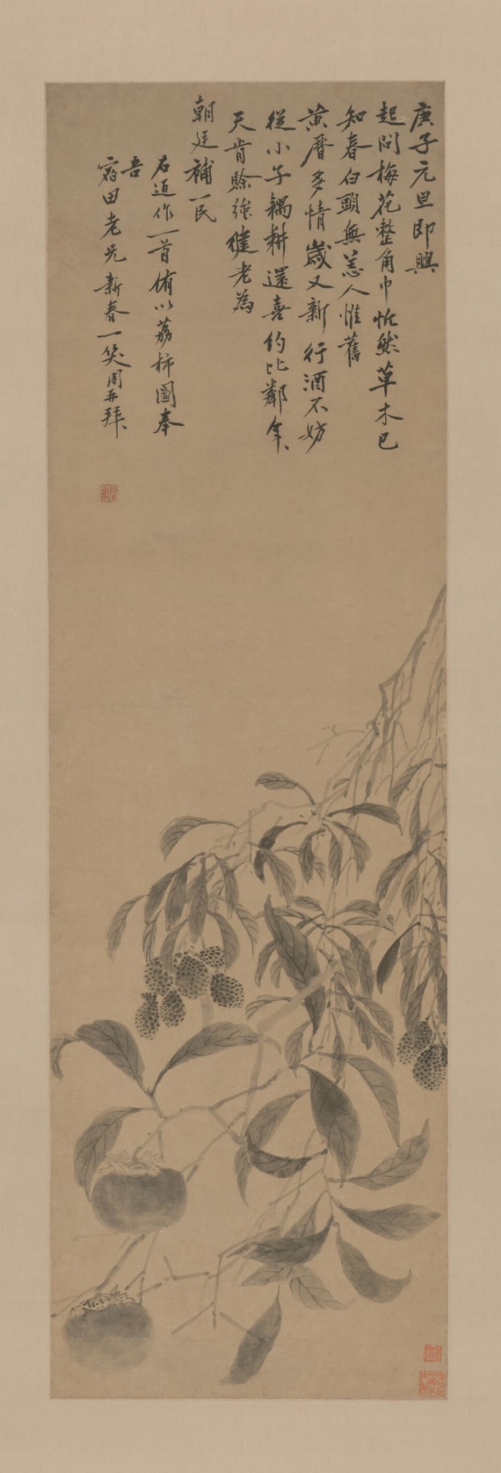 明 沈周 《荔柿图》 故宫博物院 墨笔画荔枝,柿子树二枝。所绘荔柿,谐音“利市”。