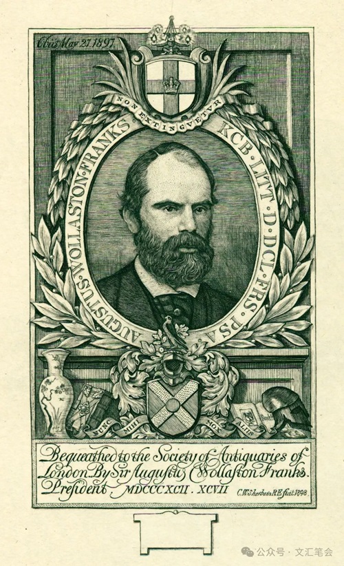 有“大英博物馆第二创始人”之称的弗朗克斯是当时收藏藏书票数量最多的个人。这是用于弗朗克斯遗赠伦敦古物学会书籍所用的藏书票,在票主去世次年作成。中央椭圆框内是弗朗克斯肖像,沿像框的文字是“奥古斯都·沃拉斯顿·弗朗克斯,巴斯骑士,文学博士,民法博士,皇家学会会员,古物学会主席”。上方为伦敦古物学会纹章,有学会的拉丁文铭文“绵延不绝”;下方为弗朗克斯纹章,铭文为“暂得于己倏忽去之”,其两边有花瓶、书籍、藏书票册等。下部文字写明遗赠之事:由1892—1897年主席奥古斯都·沃拉斯顿·弗朗克斯爵士遗赠伦敦古物学会。后接藏书票作者署名。矩形外框左上角有拉丁文:1897年5月21日去世。