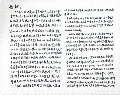十八年了,我计算您的年龄快七十了。如您还健康,相信在一二年以内一定能看到您最喜欢的一个最幼的儿子,而且使您很满意。他已长大成人,而且十八年来,始终如一地干着一件为了您和中国的一切受苦受难的人们谋幸福、求自由的事情。这个光荣的事业,有无数的人们,像您儿子一样的干着。他们更流了无数的血。但是现在已经获取了初步的成功,这就是把日本强盗打败,并使中国开始走上和平民主团结统一的道路。我们都是人民的子弟兵!而在许多地方的受苦受难的老百姓,男的女的都翻了身,从受压迫受穷变成自由幸福快乐的人。
