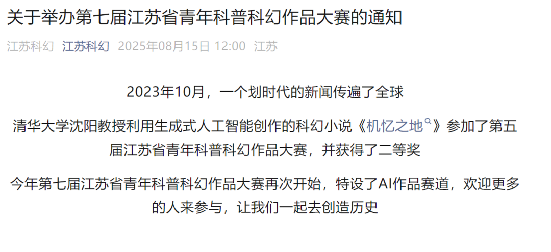 AI科幻作品赛道的出现源于2023年清华大学沈阳教授在参加第五届江苏省青年科普科幻作品大赛时的获奖作品《机忆之地》,该作品是利用生成式人工智能进行的创作,付昌义表示,设置这一赛道主要是出于三方面考虑:“一是科幻的核心是探讨科技与人类未来的关系。AI 赛道直接呼应了当下人工智能伦理、人机关系、后人类主义等热门议题,让作品更具现实关联性。二是 AI 技术正在改变我们的创作方式。比赛通过增设赛道,推动创作者探索人机协作的新模式,拓展科幻表达的边界。比如AI可能提供人类难以想到的情节设定或视觉设计,而人类负责把控主题和情感深度。三是回应与深化当下关于AI创作的争议性讨论。比如AI 生成内容如何定义原创性?人类作者的核心价值是什么?人类的创作能力是否被稀释? 也许优秀的 AI 赛道作品,正可以展现人类主导的不可替代性。”