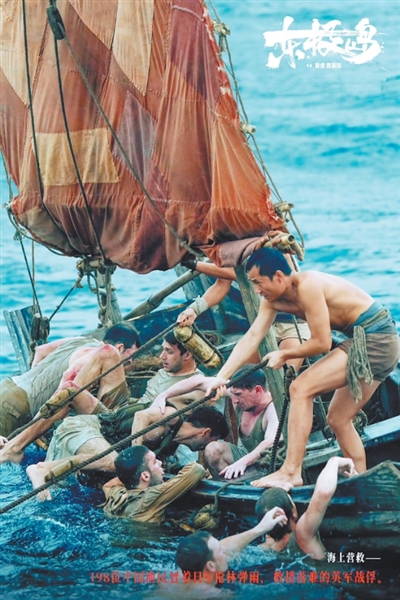 与之相比,《东极岛》发挥艺术虚构的魅力,以战争片与灾难片结合的方式重新讲述这段历史。影片虚构了阿赑、阿荡、阿花等主要人物,构建了“抗击日军+救援英俘”的双线叙事。通过展现渔民与侵略者之间的矛盾冲突,影片将叙事重点放在渔民的苦难、觉醒与抗争上,提升了戏剧浓度。三位主要人物颇具个性:阿荡天性率真、拥有平等的生命意识;阿花敢爱敢恨、勇于打破传统枷锁;阿赑则从隐忍退让、维护小家的青年,成长为嫉恶如仇、追求大义的英雄,展现出可信的人物弧光。同时,影片也兼顾了群像塑造:为护全村而慨然赴死的吴老大,逃兵出身却浴火重生的教书匠陈先生,唯唯诺诺但最后勇敢为逝者发声的保长李元兴,各有各的故事与性格。