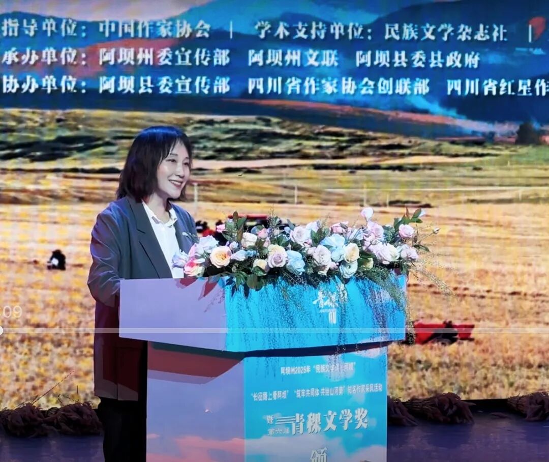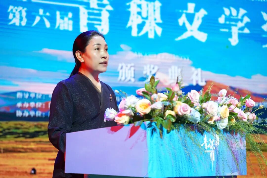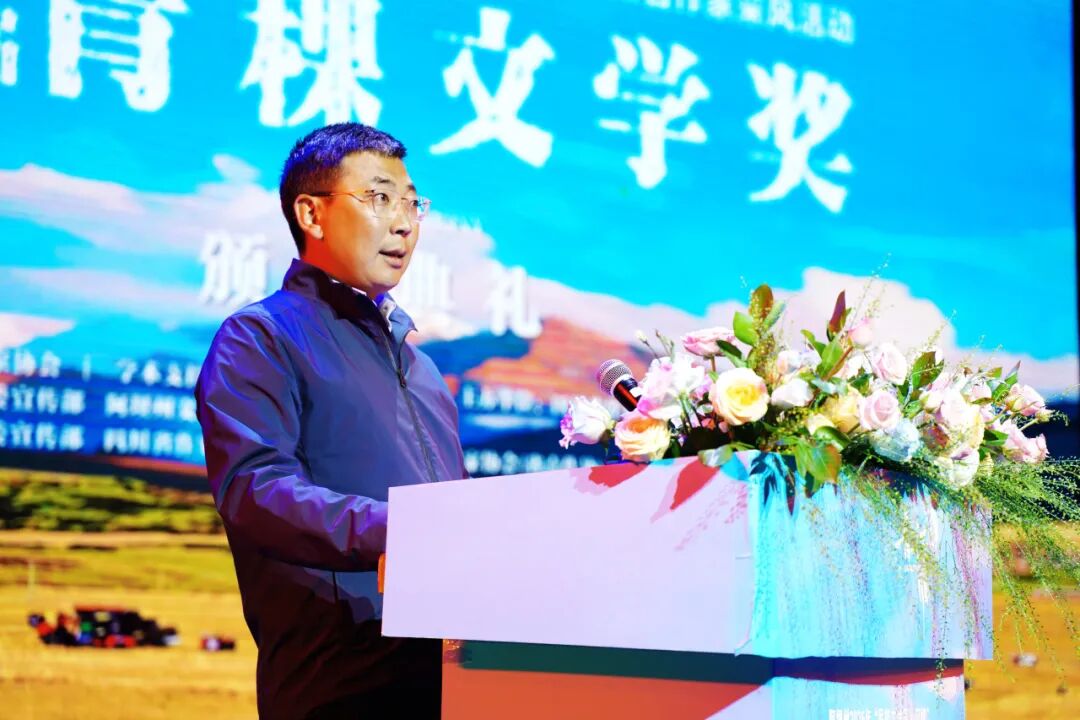 依当措在致辞中说,青稞生于苦寒,长于风霜,却结出滋养生命的果实。以它命名的文学奖,亦承载着在苍茫高原之上,寂静生长,文字如穗,渐成信仰的精神。阿坝州地处青藏高原东南缘,是全国唯一的藏族羌族自治州。这里有“童话世界”九寨沟、“人间瑶池”黄龙、中国户外第一山——四姑娘山、若诗若画若尔盖大草原、东方的魔幻世界莲宝叶则等世界知名景点,是全球拥有世界自然遗产数量最多的地区之一,是生态文明示范地、长江黄河上游重要的生态屏障和水源涵养区。这里是多彩人文绽放地。红军长征在阿坝创造了驻留时间最长、召开重要会议最多、军民关系最浓厚等“七个之最”,留下了“牦牛革命”的动人诗篇。全州拥有羌年等4项世界级非遗,有各类不可移动文物2132处,国家级非遗项目23项、省级非遗项目101项,被誉为“民族文化大走廊”“露天历史博物馆”。这里,是文旅发展引领地。黄龙成功入选世界自然保护联盟绿色名录,成为全球最佳自然保护地之一,桃坪羌寨是全省唯一的世界最佳旅游乡村。诚挚邀请各位作家老师们,常来阿坝行走、采风、书写。让你们的笔触,深入牛羊漫步的牧场、阡陌纵横的山村,真正走进各族群众火热的现实生活,走进高质量发展的生动实践,讲述阿坝的故事,让更多的人通过文学作品了解阿坝、认识阿坝、走进阿坝、爱上阿坝。