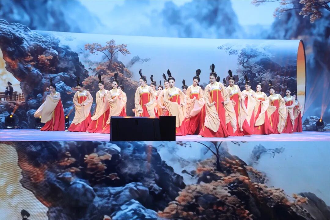 如果说《天下朋友》演绎的是一出热忱好客的迎宾曲,那么唐代诗人白居易《琵琶行》开篇“主人下马客在船”表达的就是一份希望远方宾朋多留片刻的真挚情感。千年之前,白居易到浔阳江边送客,因江面上传来一阵琵琶声留住归程,也成就了“音乐诗中的千古绝唱”。《风起东方》旋律响起,十余位舞者身着初唐时期较为普遍的鸡心领短襦和青色合欢袴,手持金色琵琶,在舞台上翩翩起舞。在舞蹈节目《琵琶行》中,舞者们迎风摆动的衣裙,飘飘翻卷的彩带,仿若从盛唐时期敦煌莫高窟的飞天图壁画中走出来,走进不夜长安的诗歌狂欢。弦音流转间,“嘈嘈切切错杂弹,大珠小珠落玉盘”的意韵犹在;琵琶声声响,传递出跨越山海的诗意和鸣。