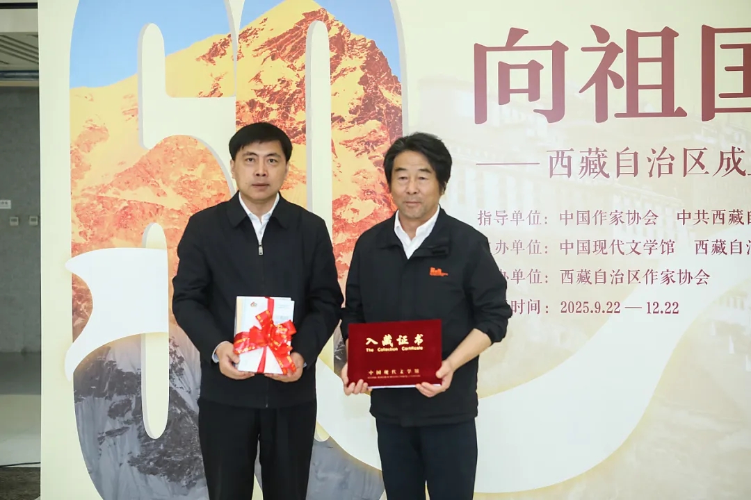 为全景展现西藏60年文学事业发展的蓬勃成果,进一步铸牢中华民族共同体意识、推进中华民族共同体建设,中国现代文学馆和西藏文联共同主办“向祖国汇报一一西藏自治区成立60周年文学成就展”。展览以铸牢中华民族共同体意识为主线,包括“时代烙印与民族风情交织的西藏文学”“多元共生与风格交融的西藏文学”“时代脉动与心灵共振的西藏文学”“铸牢中华民族共同体意识的文学实践”四个部分,以近300件手稿、书籍、期刊、证书、奖杯等实物,系统梳理从和平解放至今西藏文学的壮阔历程。