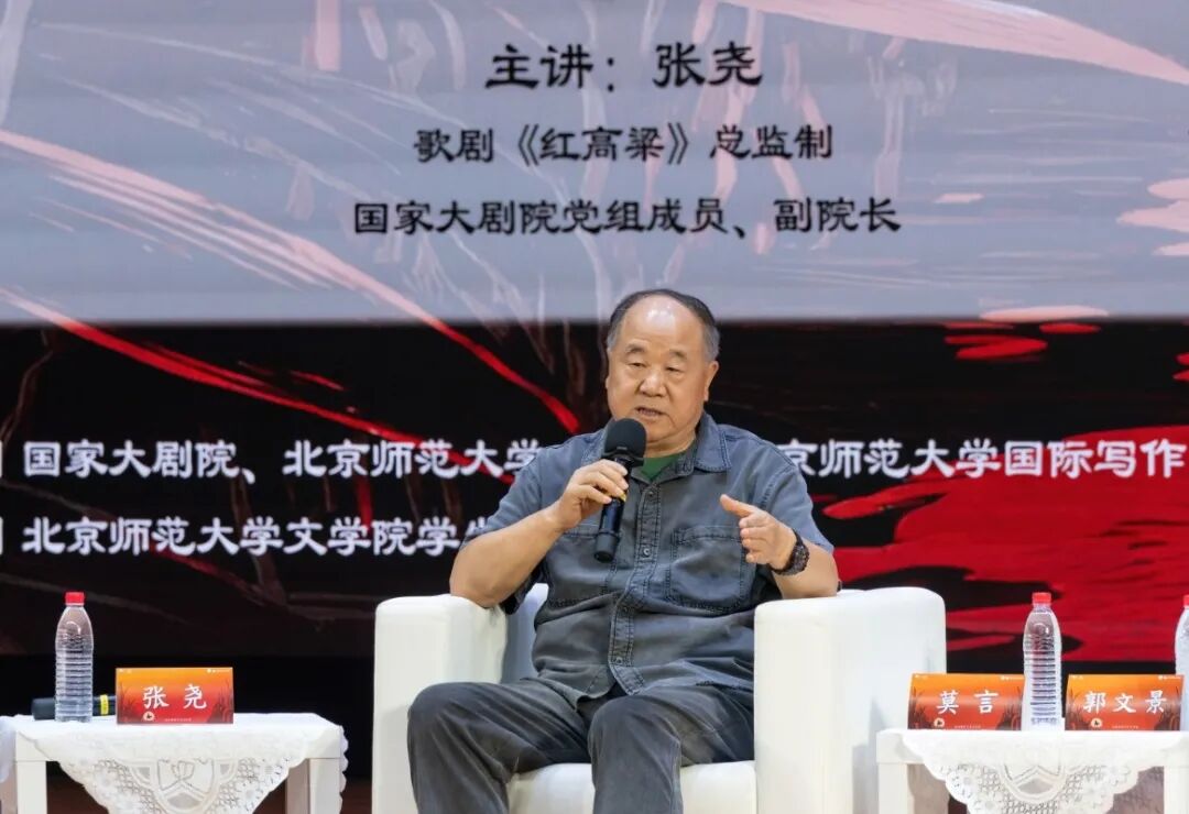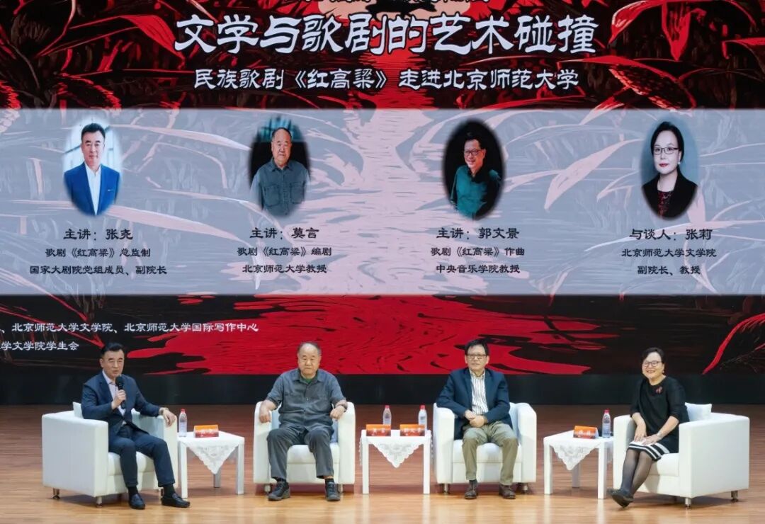 9月19日晚,国家大剧院“经典艺术讲堂”携手歌剧《红高粱》主创来到北京师范大学。国家大剧院党组成员、副院长、歌剧《红高粱》总监制张尧,歌剧《红高粱》作曲郭文景,编剧莫言与北京师范大学文学院副院长张莉进行了深入对谈,与北京师范大学文学院的师生们共同探讨歌剧《红高粱》的制作缘由与改编特色,以及如何在文艺创作中讲好中国故事、感受民族精神。