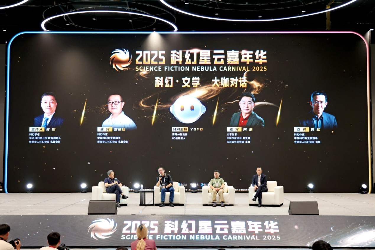 9月20日下午,本次嘉年华的重要活动——“科幻·文学大咖对话”在成都科幻馆举行。中国作协副主席、四川省作协主席、茅盾文学奖获得者阿来,科幻作家刘慈欣、韩松,围绕“人工智能与科幻未来的交融与想象”展开对谈。活动由南方科技大学教授、华语科幻星云奖联合创始人吴岩主持。值得一提的是,本次活动上,还有一位神秘嘉宾“OO后硅星人”——荣耀AI智能体YOYO,为大会增添了科幻色彩。