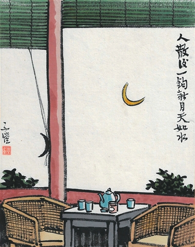 之所以是“古诗新画”,在于丰子恺在研读古代诗文时,真切感受到其穿越时间的魅力。宋代苏轼提出“诗画本一律”之说,明确了诗画相通的理论。丰子恺在《画中有诗》自序中谈道:“余读古人诗,常觉其中佳句,似为现代人生写照,或竟为我代言。盖诗言情,人情千古不变,故好诗千古常新。”就像其成名作《人散后,一钩新月天如水》,就源于宋代词人谢逸《千秋岁·咏夏景》中的最后一句。