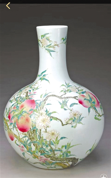 乾隆款粉彩九桃图天球瓶 清