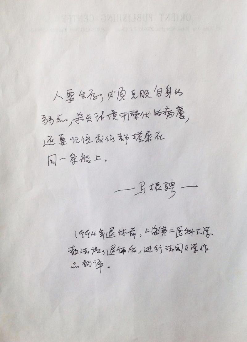 “1994年退休前,上海第二医科大学教法语,退休后,进行法语文学作品的翻译。”这是法语文学翻译家马振骋对自己的简朴介绍。