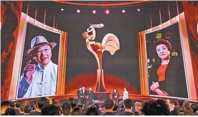 第三十八届中国电影金鸡奖颁奖典礼举行,83岁的一级演员乔榛、84岁的一级导演肖桂云(右)获颁中国文联终身成就奖(电影)。