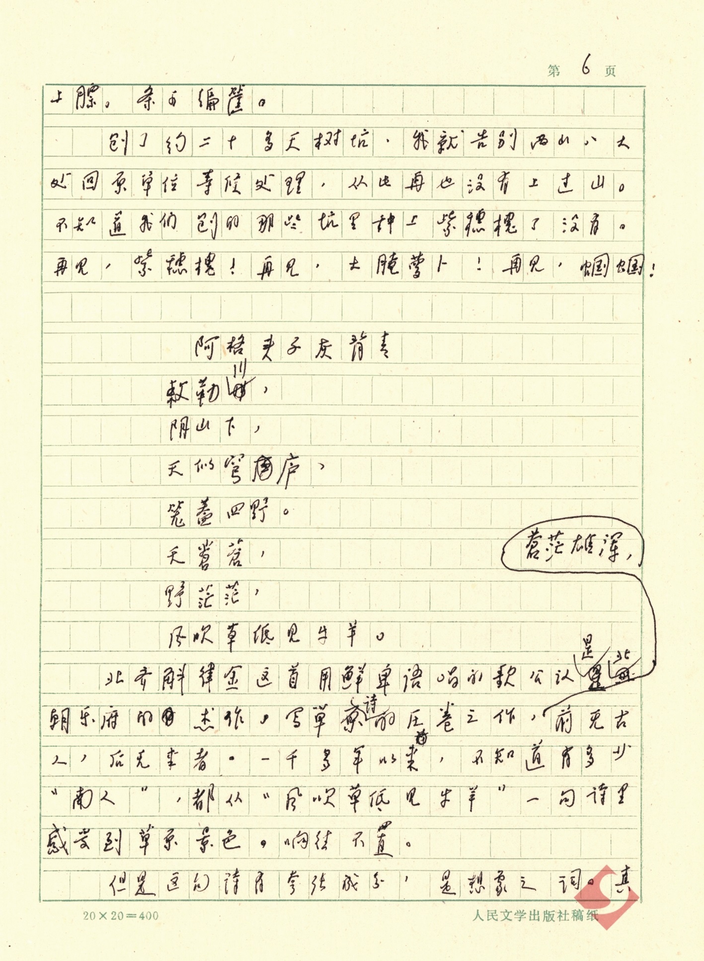 在《阿格头子灰背青》的手稿中,他由坝上草原的牧草,联想到了北齐名歌《敕勒歌》。原稿写:“写草原诗的压卷之作,前无古人,后无来者。”想了想,又在“压卷之作”之后添了四字——“苍茫雄浑”。这四个字,让整段文字忽然有了气象。文学史的评价,忽而化作草原上的长风浩荡。“苍茫雄浑”,概括了《敕勒歌》的风格,也投射出汪曾祺本人的精神向往。想象一下,一个正在塞外田垄间劳作的人,心中回响的却是“天苍苍,野茫茫”的千古绝唱。这份跨越时空的共鸣,也许正是士人之心的底色——困顿中有天地,朴实中有气度。