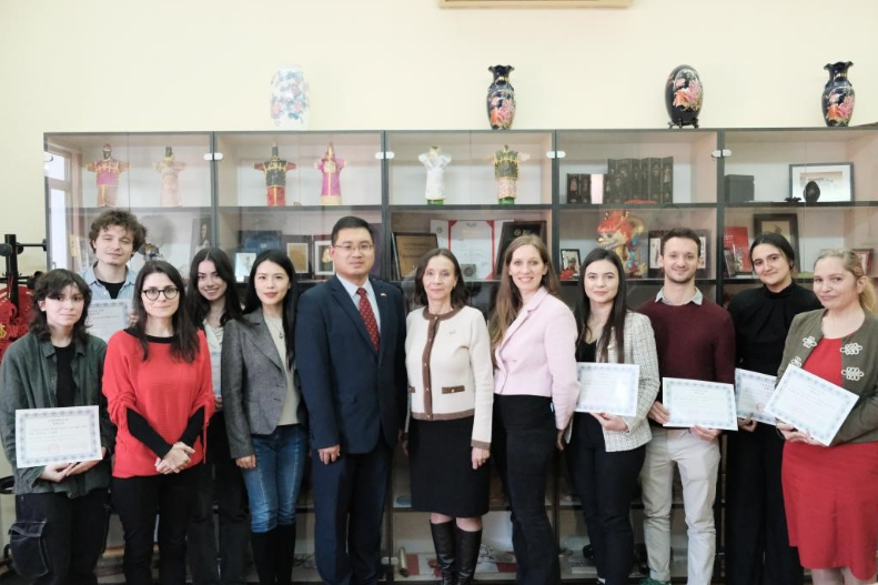 当地时间11月24日下午,首届中罗文学作品翻译大赛颁奖仪式在布加勒斯特成功举办。该比赛由布加勒斯特大学孔子学院主办、中国驻罗马尼亚大使馆支持。中国驻罗马尼亚使馆教育事务专员周国宁,布加勒斯特大学孔子学院罗方院长白罗米、中方院长苏宇以及布加勒斯特大学外国语言和文学学院教师包心茹、安德出席。获奖选手代表、孔院师生和布大中文系学生40余人参加活动。苏宇主持颁奖仪式。