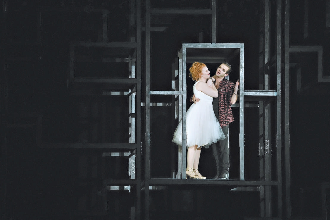 而前后两道晃眼的“流苏幕”,简直就是德国魏玛时代纸醉金迷、浮夸淫靡之社会风气、文化氛围最准确的象征,一旦撤掉灯光照射,溢彩流光马上黯然零落如败絮。至于灯光的运用,那更是要言不烦地丰富了舞台表现力。
